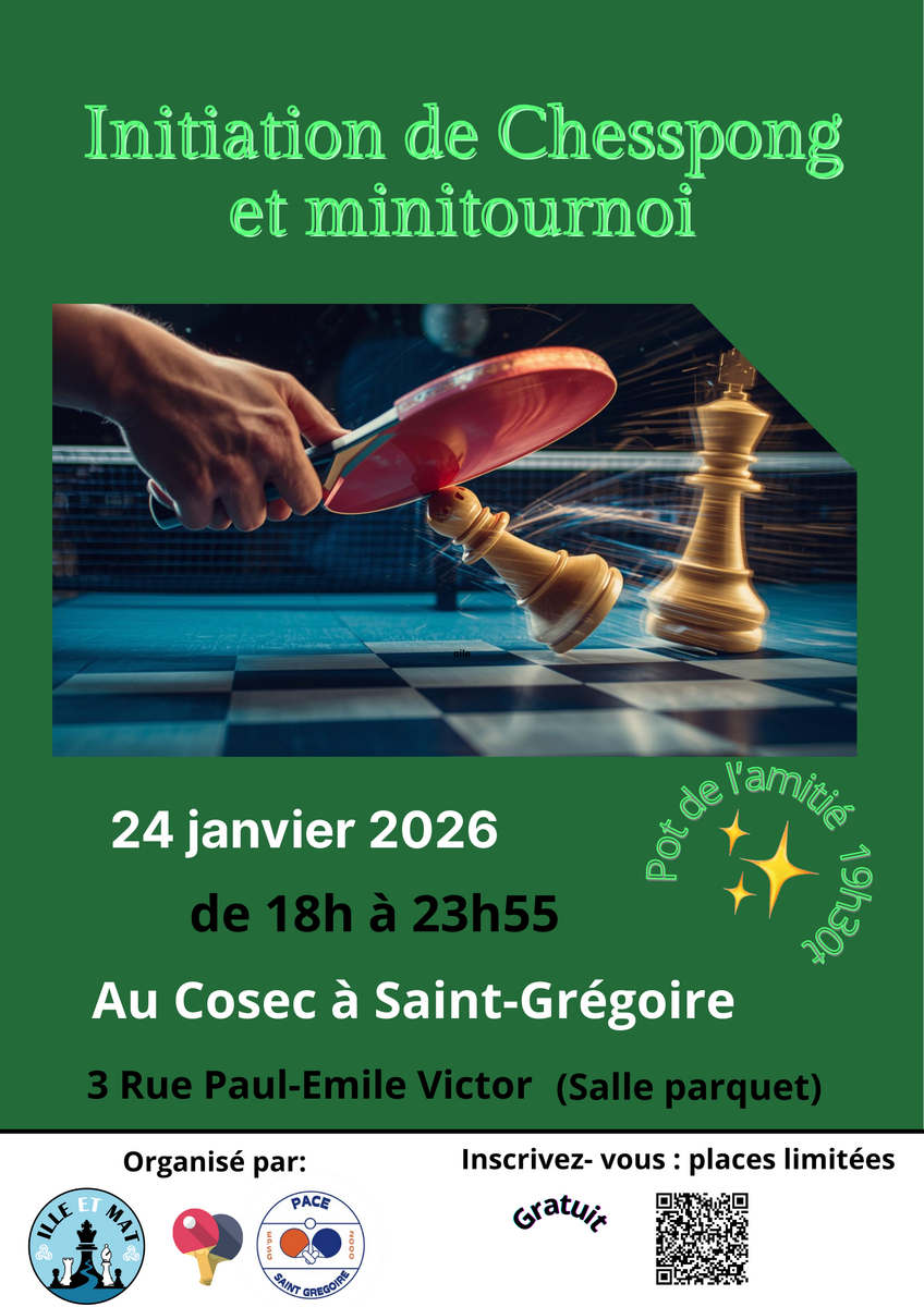en collaboration avec le club d échec de saint gregoire , nous vous proposons de faire une initiation au Chess pong comme les frères Lebrun. cette évènement aura lieux au cosec de saint gregoire le samedi 24 janvier 2026 à partir de 18h . Nous vous demandons de bien vouloir vous inscrire scanner le qr code sur l affiche . l évènement est ouvert aux adhérents des 2 du club d échec et tennis de table , le nombre de joueur sera limite si vous pouvez le faire avant le 12.01.26 car nous faisons une réunion avec le club d echec le 13.01.26 pour fixer les modalités du déroulement de la soiree